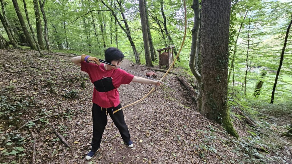 Das besondere Highlight dieses Sommers war unser gemeinsamer Ausflug auf den 3D-Parcours – und zwar nicht mit Reiterbogen, Longbow oder modernem Hightech-Equipment, sondern stilecht mit dem Kyudobogen! Auch wenn das eher ungewöhnlich erscheinen mag: Unsere Bögen erreichen Geschwindigkeiten, die klassischen Bogenarten in nichts nachstehen. Mit etwas Übung und einem guten Gefühl für Entfernungen lassen sich die Ziele erstaunlich sicher treffen.
